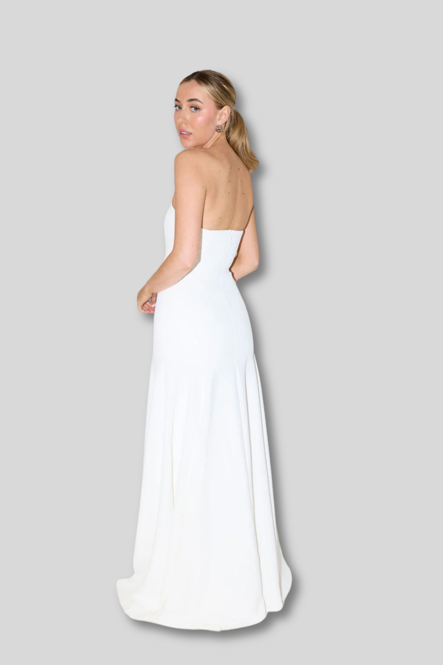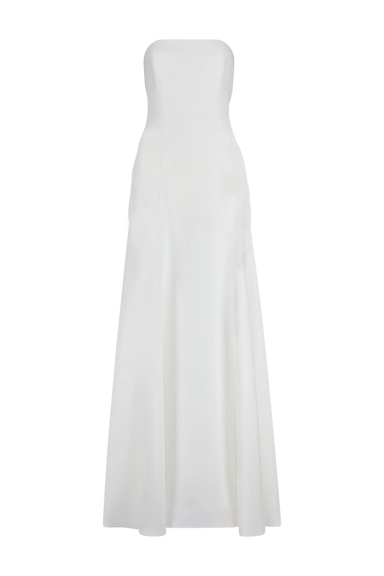 Confectionnée dans un tissu légèrement stretch à la tenue impeccable, cette robe épouse délicatement les courbes grâce à sa coupe sirène structurée, mettant en valeur la silhouette tout en offrant un tombé fluide et élégant jusqu’au sol.